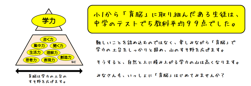 育脳寺子屋では、様々な教材や教具を使用し、学校とは違う切り口で様々な能力を伸ばします。その結果、学校準拠ではないことに取り組んでいるのに学校の成績にも反映されます。
